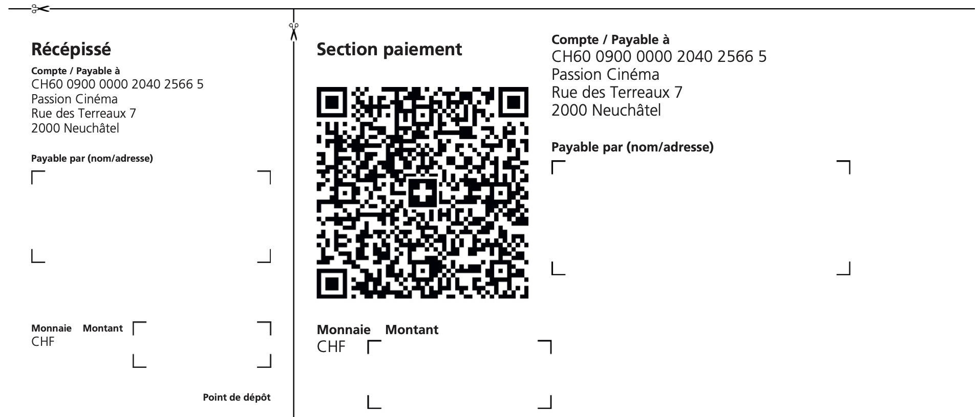 Vous pouvez aussi vous abonner, renouveler votre abonnement ou devenir membre en versant directement la somme correspondante sur le CCP n°20-402566-5 (IBAN: CH60 0900 0000 2040 2566 5), Passion Cinéma, Neuchâtel, sans oublier de mentionner vos nom, prénom et adresse. Ou en scannant directement le QR ci-après avec votre application de e-banking: